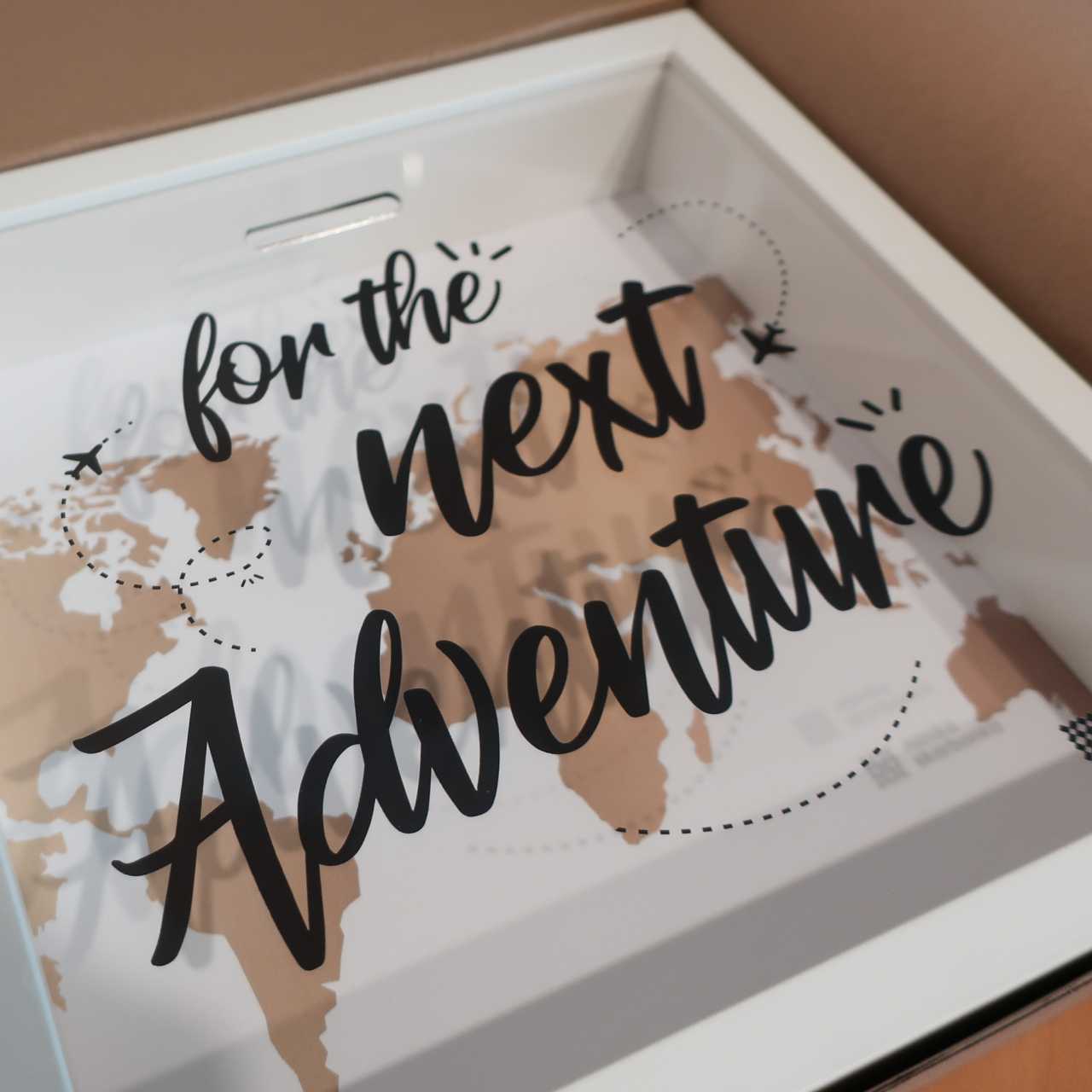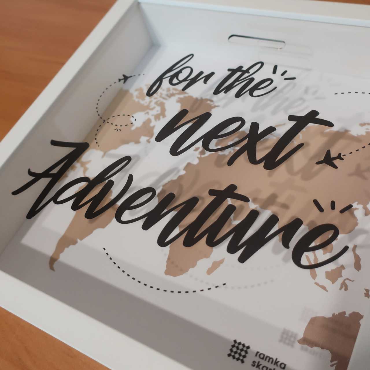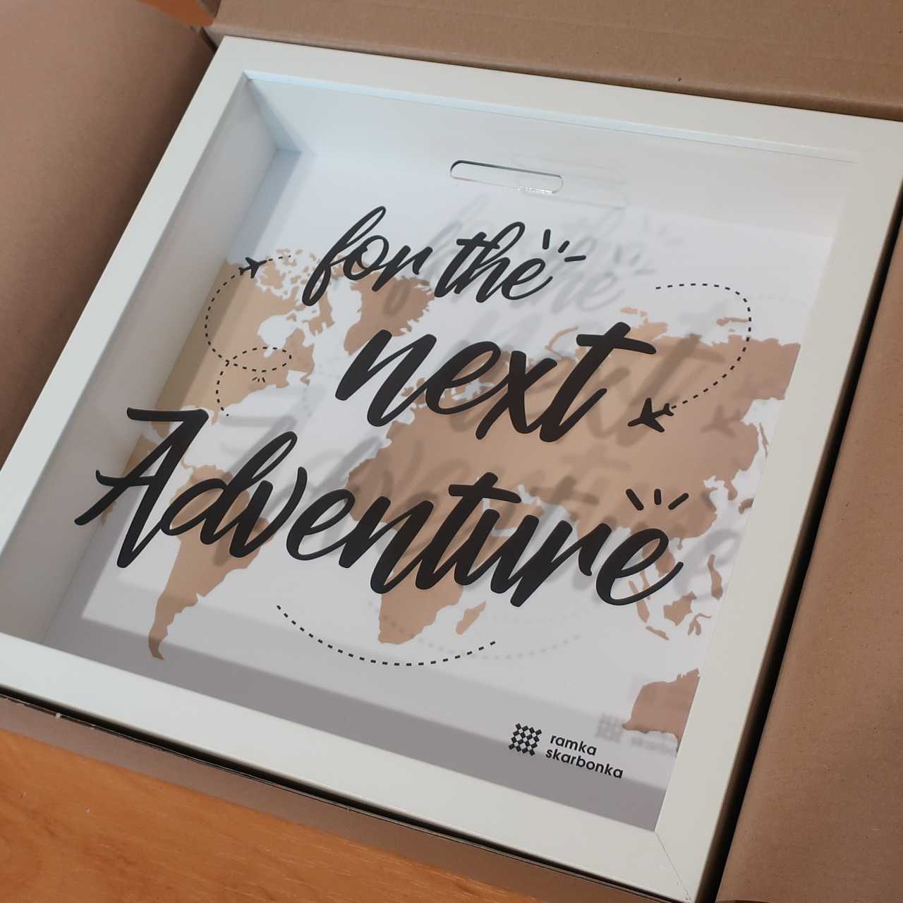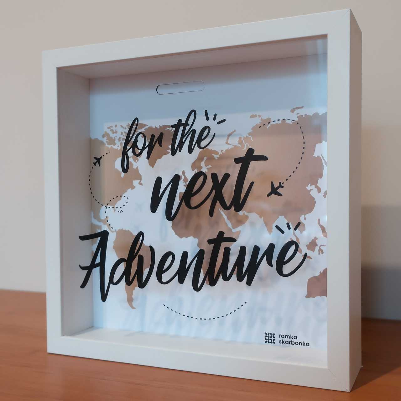 Czarny napis nadrukowany na przezroczystej pleksie („For the next adventure” – „Na następną podróż”) pobudza do działania i jeszcze bardziej motywuje do oszczędzania! Tekst pisany ręcznym fontem jest uzupełniony o drobną ilustrację dwóch samolotów z charakterystycznymi smugami, jakie za sobą zostawiają (tzw. smuga kondensacyjna). Jeśli nie zauważyłeś ich za pierwszym razem, koniecznie zajrzyj ponownie do naszej galerii zdjęć!