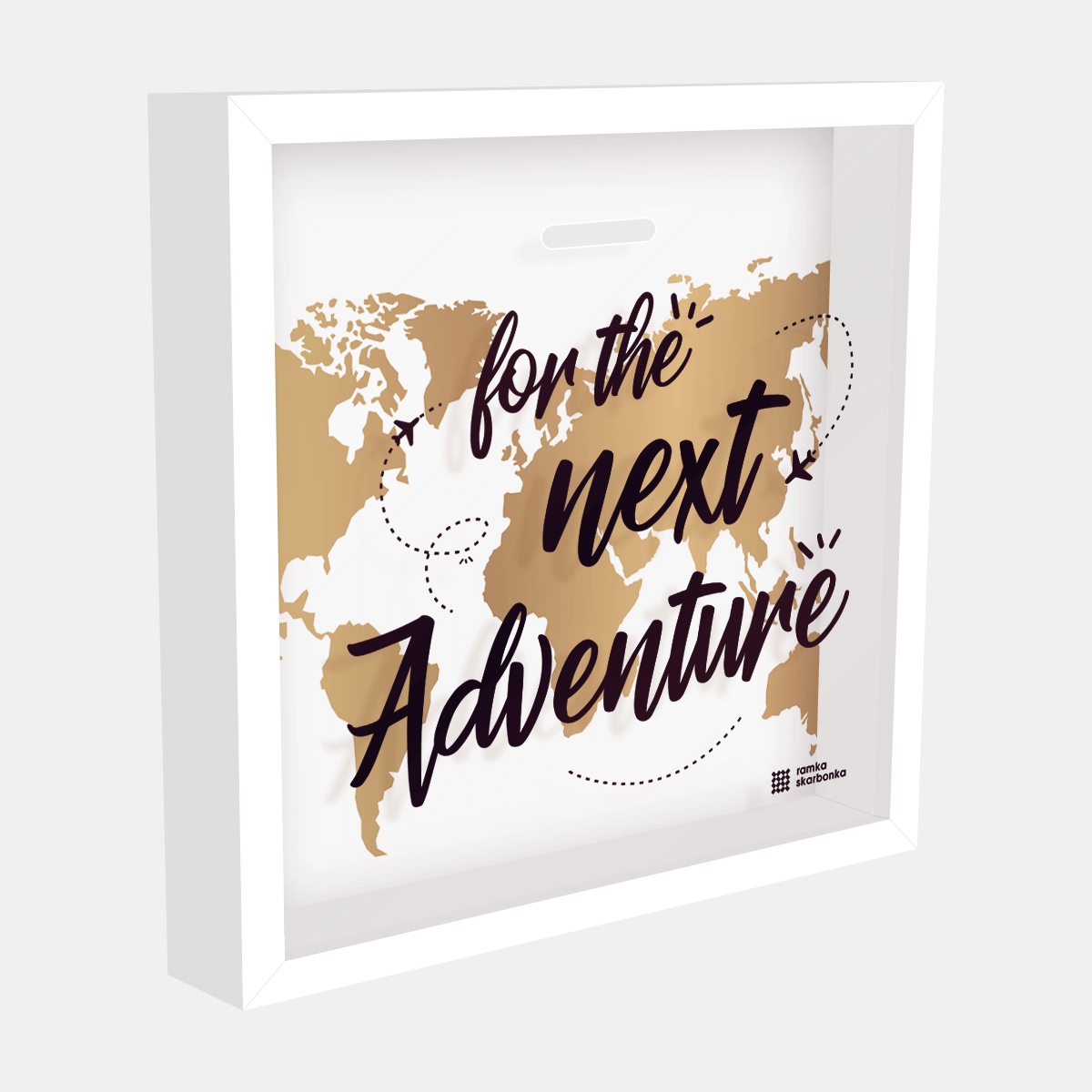 Malta, Seszele, Zanzibar? A może coś bardziej lokalnego – Bieszczady, Sopot, Mielno? Jaki jest cel Twojej kolejnej podróży? Na każdą z niesamowitych przygód związanych z małymi i wielkimi wojażami poleca się Ramka Skarbonka! A właściwie na oszczędzanie i gromadzenie środków na te wyjazdy. Ramka ze złotą mapą świata na białym tle sprawdzi się wyśmienicie jako przypominajka w Twoim mieszkaniu, aby dokładać w każdym tygodniu choćby najmniejszą kwotę na spełnianie marzeń o kolejnej podróży.