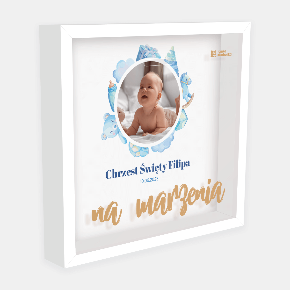 W tle tej Ramki Skarbonki umieszczamy zdjęcie malucha, a wokół niego pojawiają się kolorowe ilustracje – miś, konik na biegunach, chmurki, prezenty i samochodzik tworzą pełną ciepła oprawę dla tej wyjątkowej pamiątki. Z przodu ramki znajduje się przezroczysta pleksa ze złotym napisem „na marzenia”, a w tle umieszczone jest zdjęcie dziecka, ilustracje i napisy, wydrukowane na papierze satynowym.