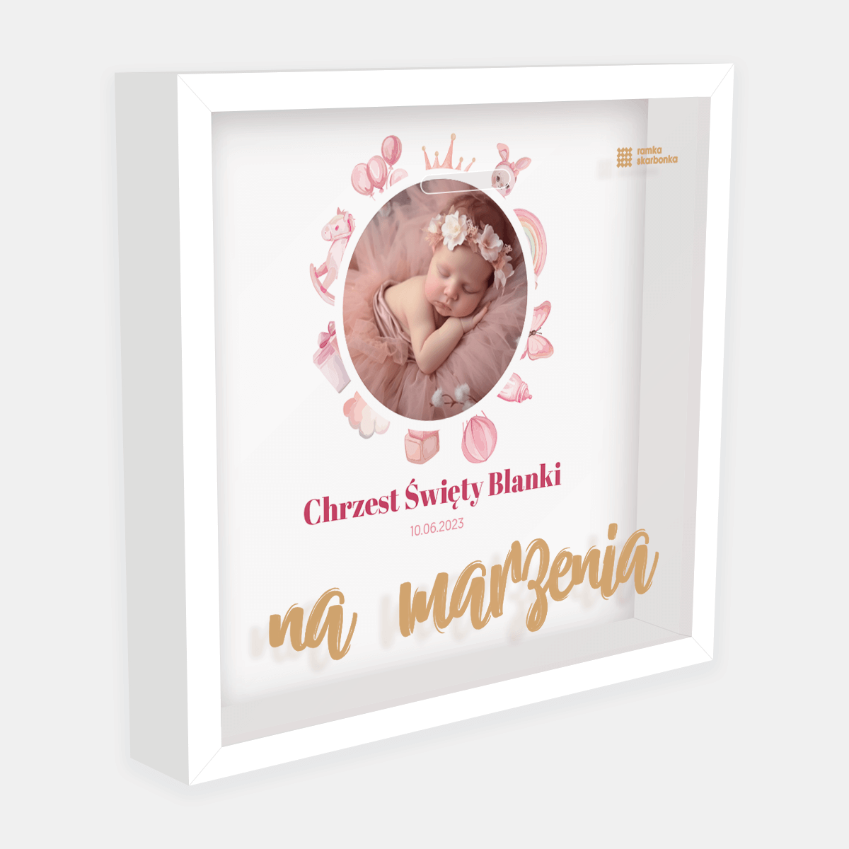 Ta Ramka Skarbonka to wyjątkowa pamiątka dla dziewczynki z okazji Chrztu Świętego. W tle nadrukowane jest przesłane zdjęcie dziecka, a wokół niego znajdują się pastelowe ilustracje – królik, konik na biegunach, tęcza, motylek, chmurka, butelka, balony i korona. Wszystko w delikatnych odcieniach różu, które tworzą ciepłą, bajkową oprawę. Z przodu ramki znajduje się przezroczysta pleksa ze złotym napisem „na marzenia”, a w tle umieszczone jest zdjęcie dziecka, ilustracje i napisy, wydrukowane na papierze satynowym.