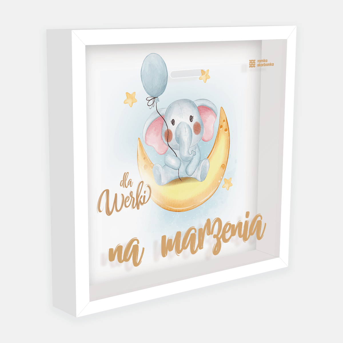 Słonik siedzący na księżycu, trzymający niebieski balonik wśród rozrzuconych gwiazdek – trudno o bardziej uroczy obrazek, który rozczuli każdego małego marzyciela (i jego rodziców). Ramka Skarbonka z tą ilustracją to doskonałe połączenie bajkowego klimatu z praktycznym celem – oszczędzaniem na dziecięce marzenia.